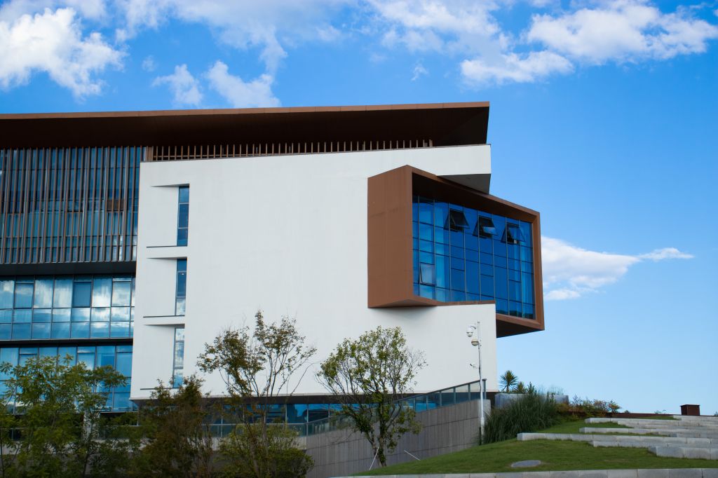 紅墻褐頂的新農科大樓在藍天白云的映襯下,