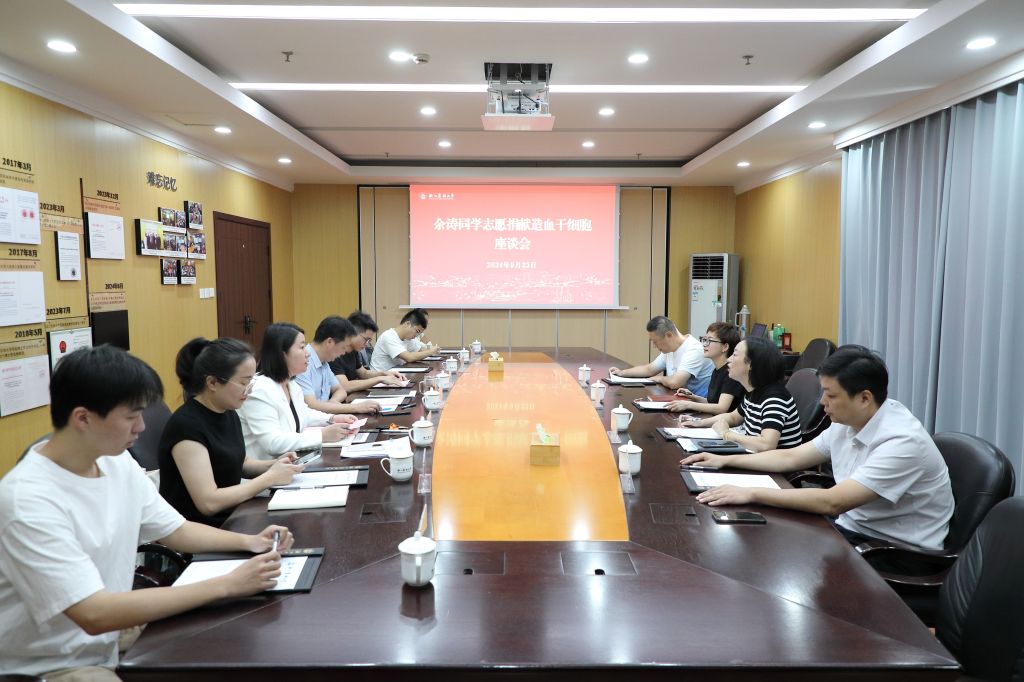 9月23日上午,余濤同學即將出發(fā)捐獻造血干細胞之前,學校舉行座談會,校黨委副書記倪建均,臨安區(qū)紅十字會黨組書記、常務副會長胡小燕,數(shù)計學院黨政領導等出席會議,校團委負責人主持會議。倪建均對余濤同學的善舉表示了敬意和感謝,他指出,余濤同學的行為不僅展現(xiàn)了強烈的社會責任感、體現(xiàn)了個人的勇氣和決心,更是對生命價值的深刻理解和尊重。同時,他要求學校和學院借此機會樹立正面典型,鼓勵更多的學生參與到社會公益活動中來,培養(yǎng)有擔當?shù)男聲r代青年。
