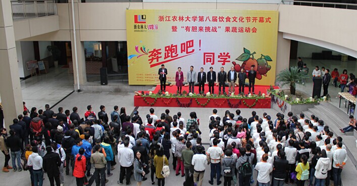 11月8日,以“舌尖上的生態農林”為主題的浙江農林大學第八屆飲食文化節在活動中心開幕。校黨委委員、宣傳部部長陳永富出席開幕式并宣布飲食文化節開幕。校團委、學工部、建管處、保衛處、后勤集團等相關領導,飲食服務中心、接待服務中心員工代表,校學生會、各學院學生代表及留學生代表共200余人參加了開幕式。