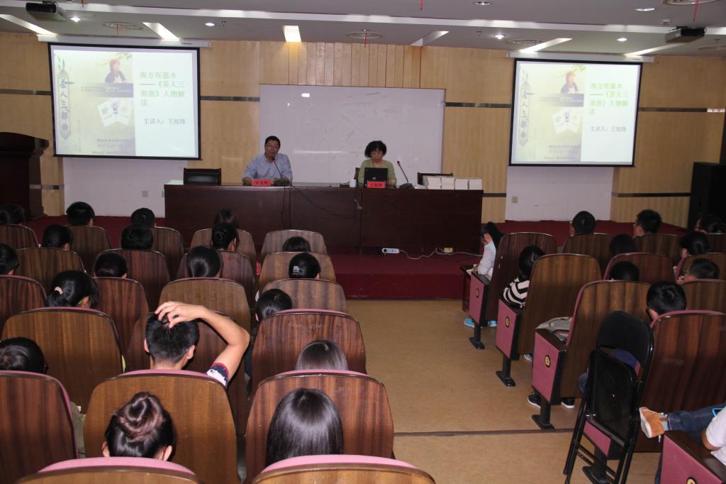 除了講述自己的創作過程,王旭烽還談了自己對小說的見解。她認為小說的題材是極其重要的。“別的作家是去體驗生活,而我是本身就在生活中”,只有融入平凡的生活,才能選取有意義有趣味的主題,寫出真正深刻的文字。同時一部小說的題目非常重要。一個小小的題目會透露出大量的信息,并且反映出作者的文化底蘊。在小說人物性格方面,她以《茶人三部曲》中主人公杭天醉為例,強調地域帶來的人文性格特色,她希望同學們能夠仔細觀察身邊的人,尋找身邊不同的人格,培養人文情懷。她還強調了小說結構的重要性,并簡單講述了小說的故事、情節以及地域文化和風情描述的作用。