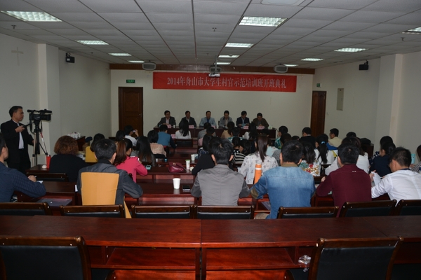 10月28日上午,2014年舟山市大學生村官示范培訓班開班典禮在我校東湖校區活動中心舉行,此次培訓為期5天,由舟山市委組織部和我校村官學院聯合舉辦。校黨委副書記、村官學院院長余杰,舟山市委組織部人才處副處長趙華,法政學院院長、村官學院常務副院長王長金,法政學院、學工部、校團委相關負責人以及舟山各區、縣委組織部相關人員出席了本次活動,舟山市40名大學生村官代表參加了本次典禮。