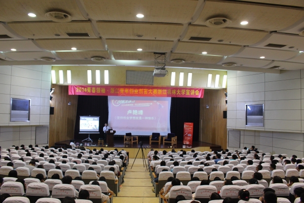 9月25日,由浙江省委宣傳部、共青團浙江省委、浙江省教育廳、浙江日報報業集團指導,郵儲銀行浙江分行、浙江在線主辦的創富先鋒——2014青春領袖·浙江青年創業創富大賽首場宣講會在我校圖書館第一報告廳舉行,浙江在線新聞網站編委、戰略發展中心主任俞斌及我校黨委宣傳部相關負責人出席活動?;顒友埖搅恕白蠲勒憬恕?012青春領袖”、全國就業創業先進個人、嘉善縣美華水產養殖場廠長、我校校友楊珍及浙大樂創會創始人盧艷峰作為嘉賓與師生分享創業感悟。
