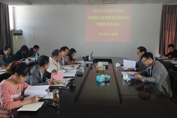 根據學校黨的群眾路線教育實踐活動的安排部署,11月8日全天,林業與生物技術學院黨委班子召開專題民主生活會。校長周國模、校黨委組織部部長童曉暉出席會議。學院黨委班子全體成員,分工會、學科(中心、兩辦)負責人,教工黨支部書記,輔導員,學生代表等20余人參加會議。