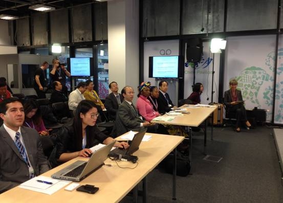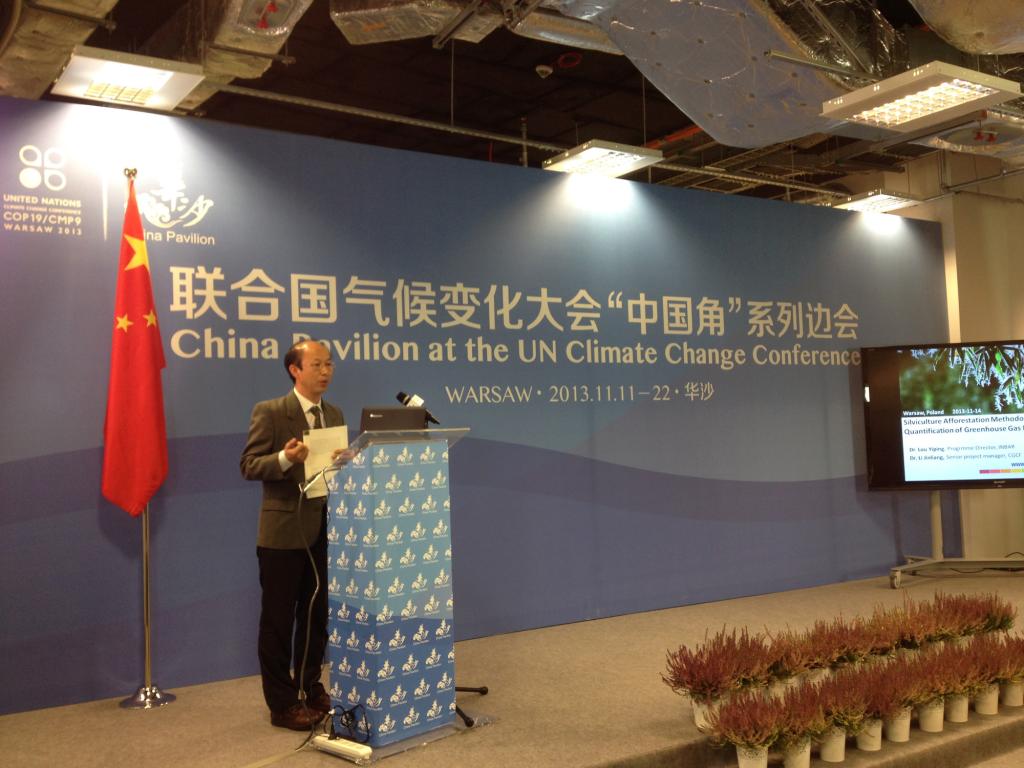 11月14日上午,由國際竹藤組織、中國綠色碳匯基金會聯合主辦的華沙聯合國第十九次氣候變化大會“中國角”首場研討會——“林業碳匯的產權及標準化研討會”在波蘭華沙聯合國氣候大會中心舉行。國際竹藤組織環境項目主任、我校非洲農林研究院院長樓一平出席會議,并在研討會上演講。
