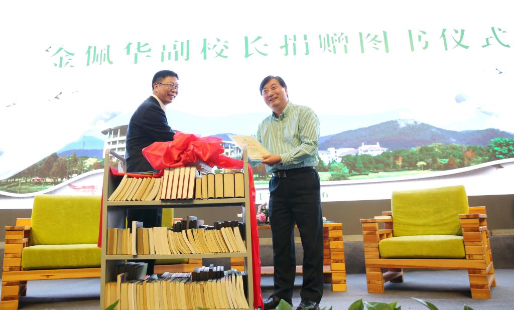 活動現(xiàn)場,校領導為喻樹迅、王旭烽、俞德超頒發(fā)“閱讀推廣大使”聘書,副校長金佩華向圖書館捐贈個人藏書500冊。