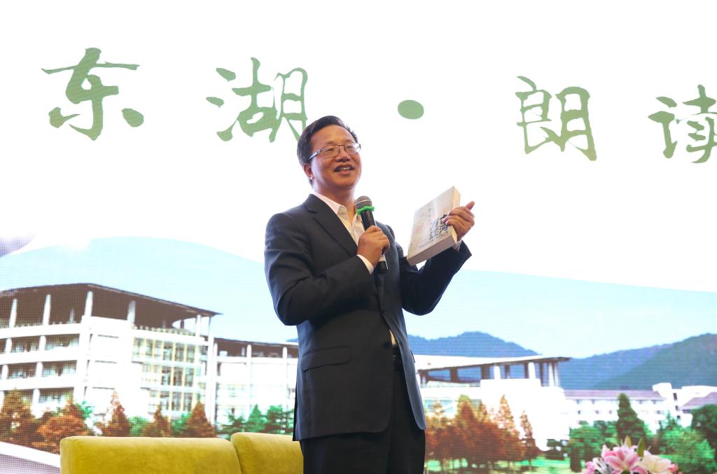 中國工程院院士、農學院喻樹迅教授及其夫人,茅盾文學獎獲得者、文化學院院長王旭烽教授,杰出校友、信達生物制藥(蘇州)有限公司董事長俞德超博士應邀參加,與大家分享了自己讀書、創(chuàng)新創(chuàng)業(yè)的故事。喻樹迅和夫人向大家推薦了《鋼鐵是怎樣煉成的》和《紅巖》,并朗讀毛澤東詩作《沁園春?雪》;王旭烽朗讀自己的散文作品《等花落下來》,向大家推薦了《屠格涅夫散文詩集》和電影《阿甘正傳》;俞德超朗讀汪國真的作品《我喜歡出發(fā)》,并推薦書籍《萬古江河》。
