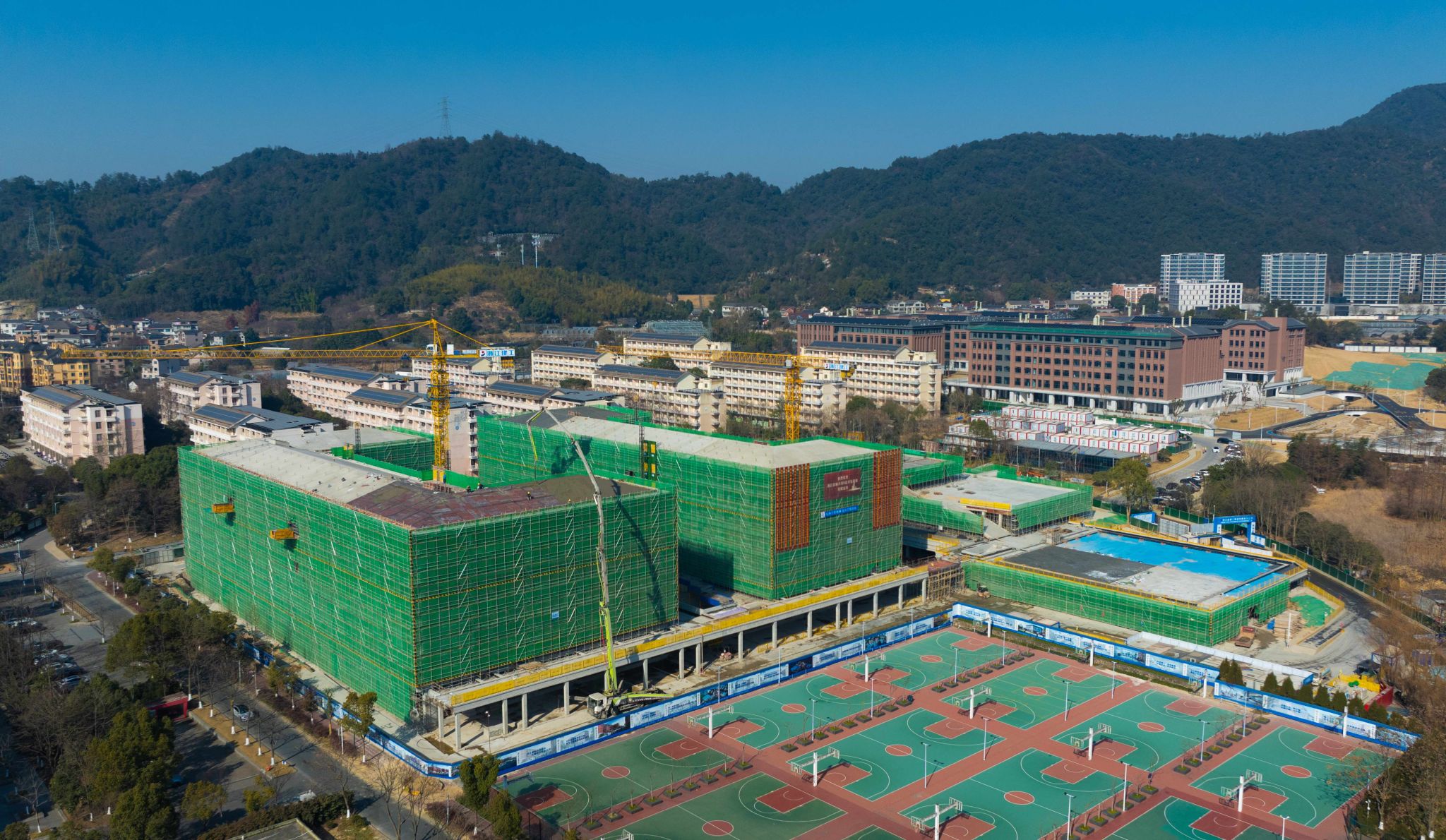 在施工現場,盡管在校生們已放寒假,但本該日漸冷清的浙江農林大學校園里,依然熱火朝天。兩幢6層高的學生宿舍樓、學習中心、食堂里,近百名建筑工人正加班加點,忙得不亦說乎,塔吊、臂架式混凝土泵車加足馬力,完成最后的工作。隨著主體結構順利結頂,項目的建設重點,開始轉到內部砌體及二次結構施工、室內外裝飾裝修。同時,屋面電梯,電氣、消防、弱電等工程等也將陸續開展,相關參建單位將進一步齊心協力、嚴把安全關、質量關,確保進度,按計劃投入使用。