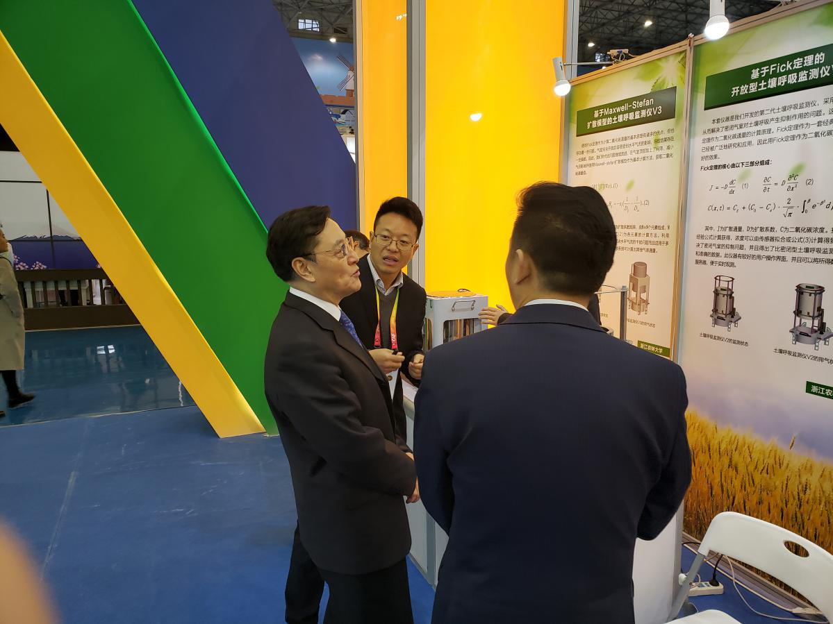 在展會上,科技部副部長張景安等仔細觀看土壤呼吸監測儀,聽取胡軍國教授講解,對我校科研成果表示贊賞,并提出寶貴的意見和建議。有多家單位及科研人員來展位了解土壤呼吸監測儀的作用、功能、參數和性能指標等,有三家單位與胡軍國團隊達成了意向協議。