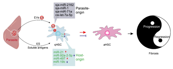 纖維化本質上是一種組織修復過程,在任何原因引起的組織損傷下都會發生,其主要特征為胞外基質(ECM)的穩態失衡,使得其過度合成并沉積。在肝纖維化過程中,ECM主要由活化的肝星狀細胞(HSC)合成,而HSC在正常情況下處于靜息狀態,所以HSC的活化是肝纖維化發生的關鍵環節。在感染期間,寄生蟲一方面可通過胞外囊泡(EVs)將其miRNAs釋放到HSC中,促進或抑制HSC活化;另一方面,還可通過分泌/代謝抗原(ES)和可溶性抗原影響宿主miRNAs的表達水平,促進或抑制HSC活化,從而參與肝纖維化發生。在這種共同作用下,肝纖維化的發展和消退在短期內保持相對穩定(圖1)。